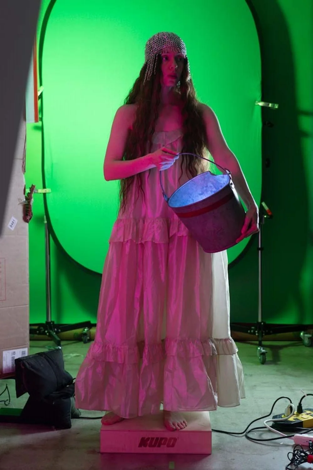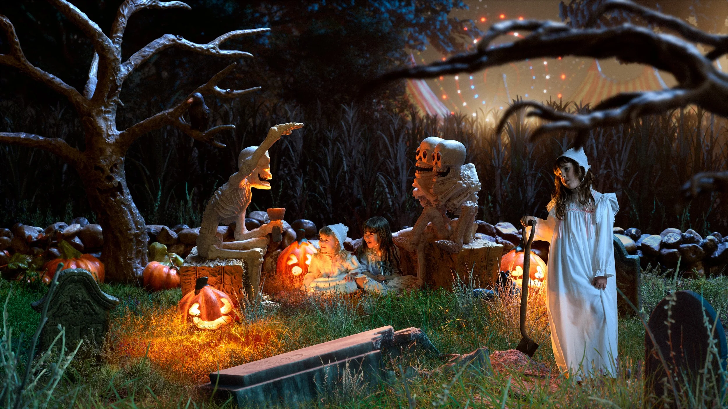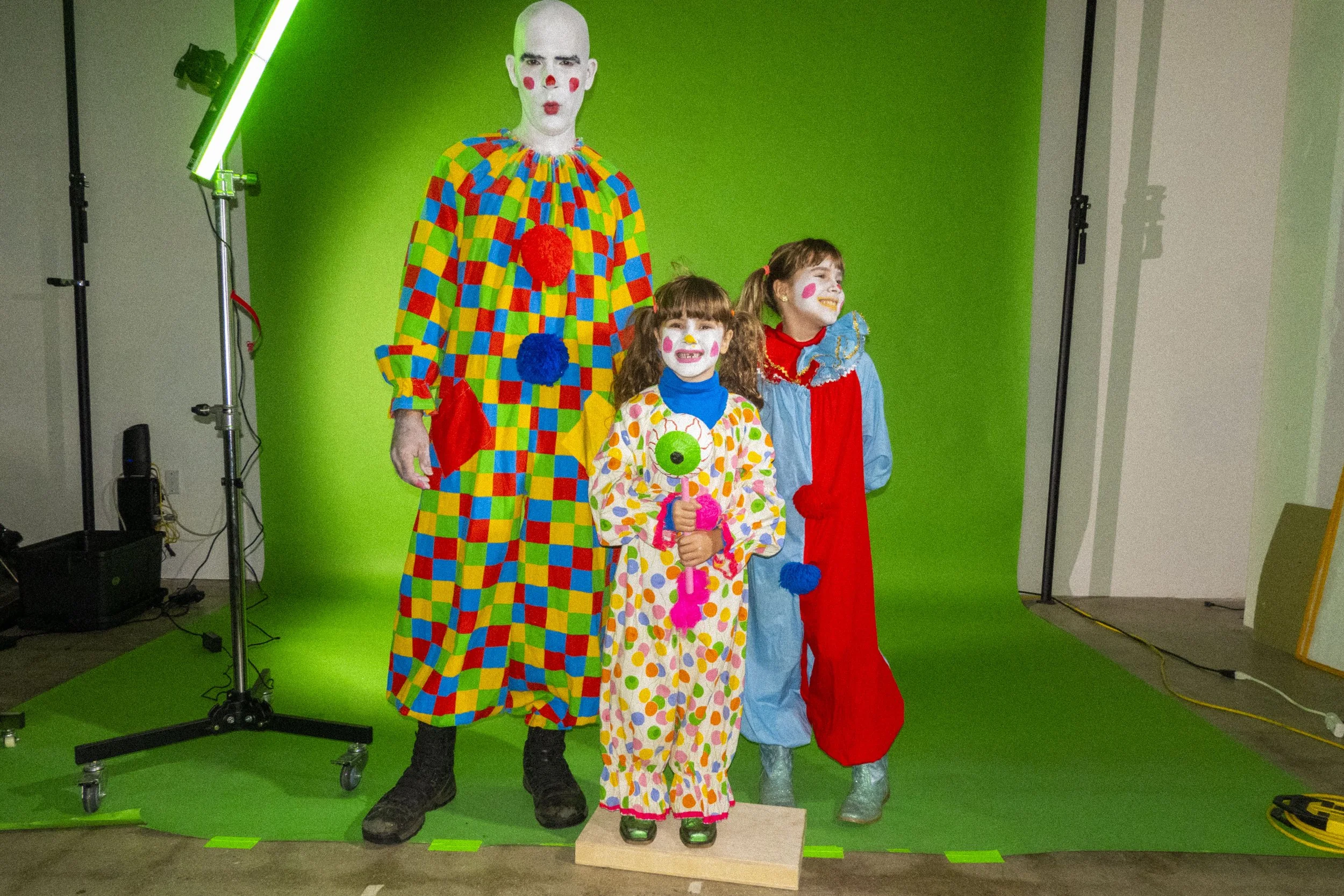 The characters, a family of carnival performers in a dark carnEVIL-themed world, were primarily captured on greenscreen. On set, lighting was designed to match the direction, color, and intensity of the corresponding virtual environments for seamless compositing in post-production.