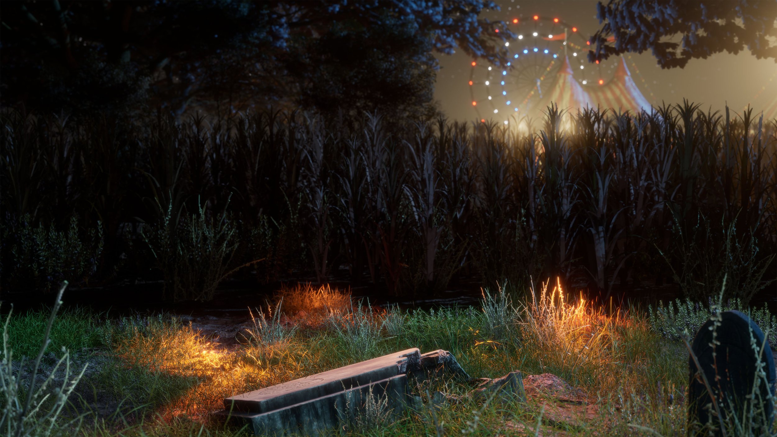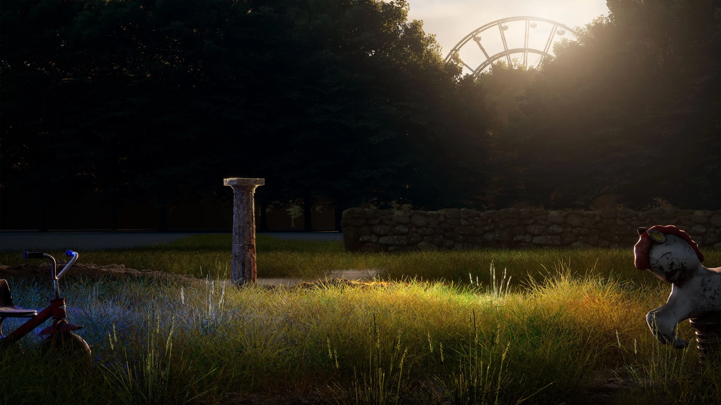 The environments were constructed primarily in Unreal Engine, integrating Megascans, Fab assets, and custom geometry. Due to limitations in Unreal’s hair and feather rendering, the chickens in the Rotten Candy sequence were rendered in Arnold from Maya for improved feather realism. The Unreal scenes were built in layers to facilitate compositing of the photographed miniatures during post-production. All Unreal renders were produced using pathtracing and at a 12,000 × 6,750 resolution suitable for large-format print output.